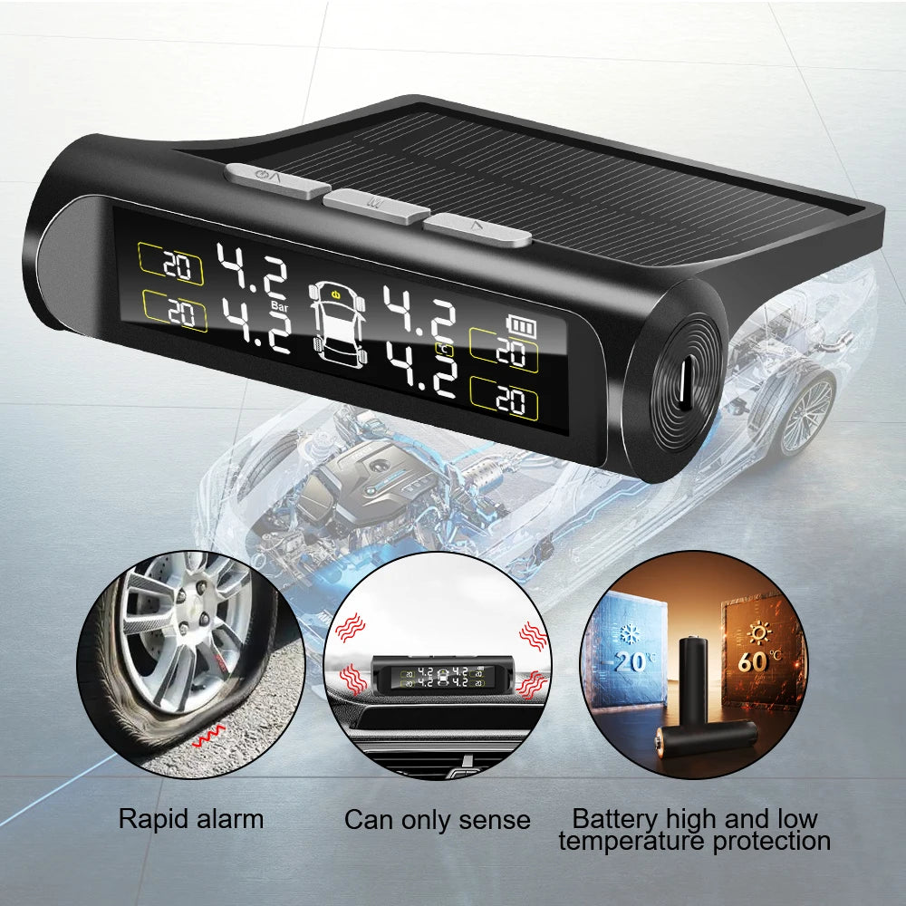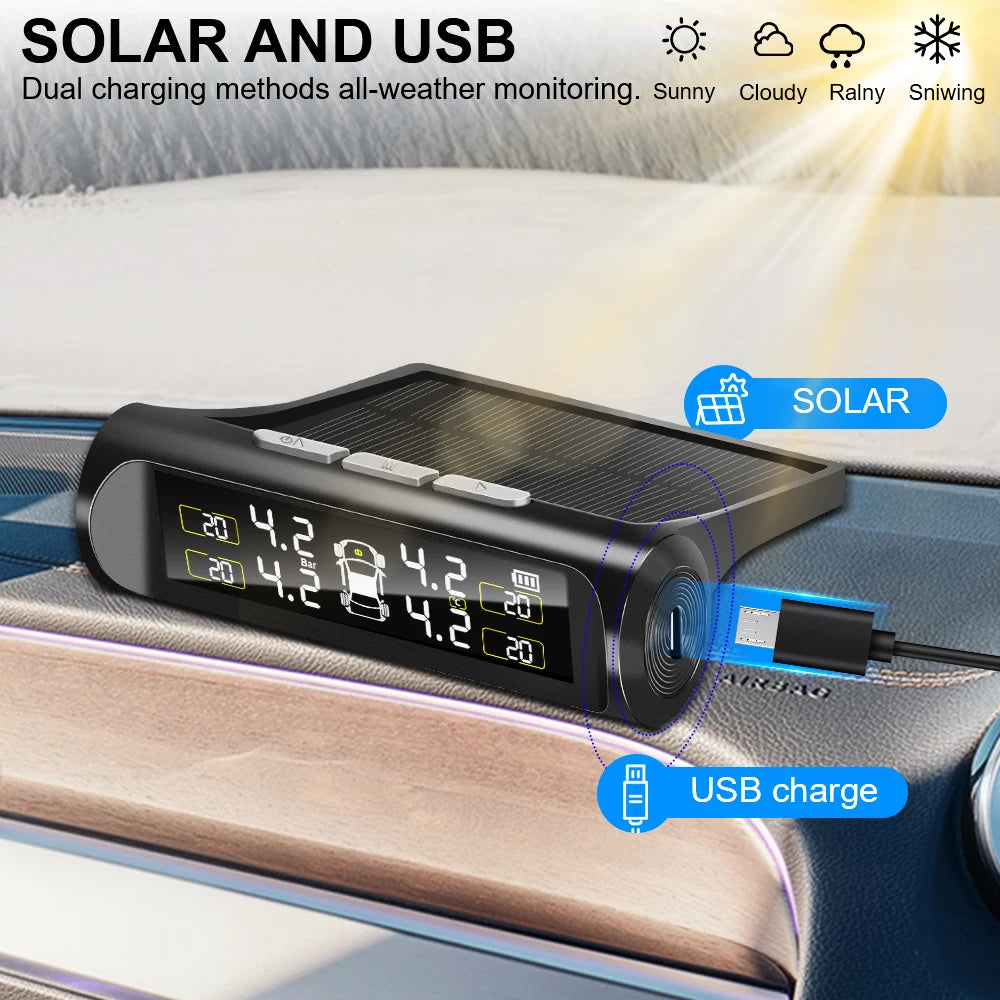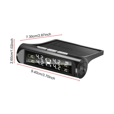 Stay safe on the road with this wireless TPMS (Tire Pressure Monitoring System), powered by solar energy or USB. Designed with a colorful LCD display, it provides real-time updates on tire pressure and temperature for all four tires.