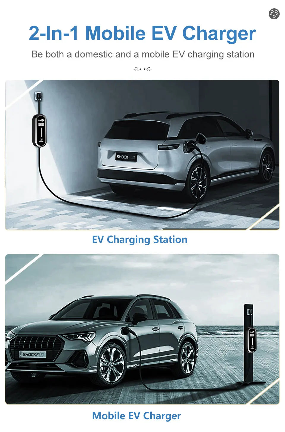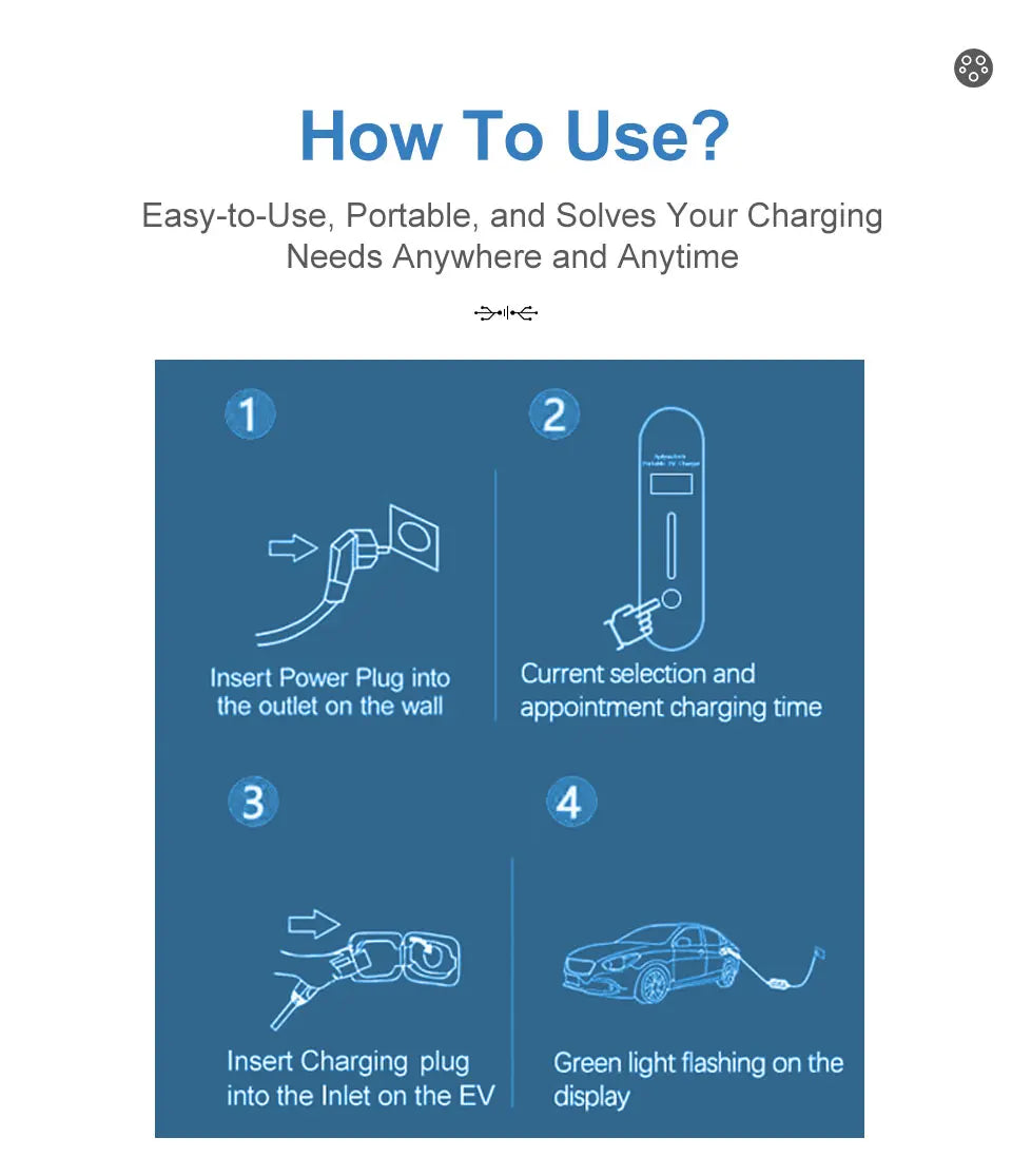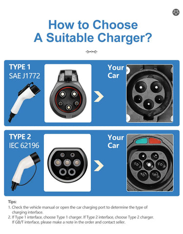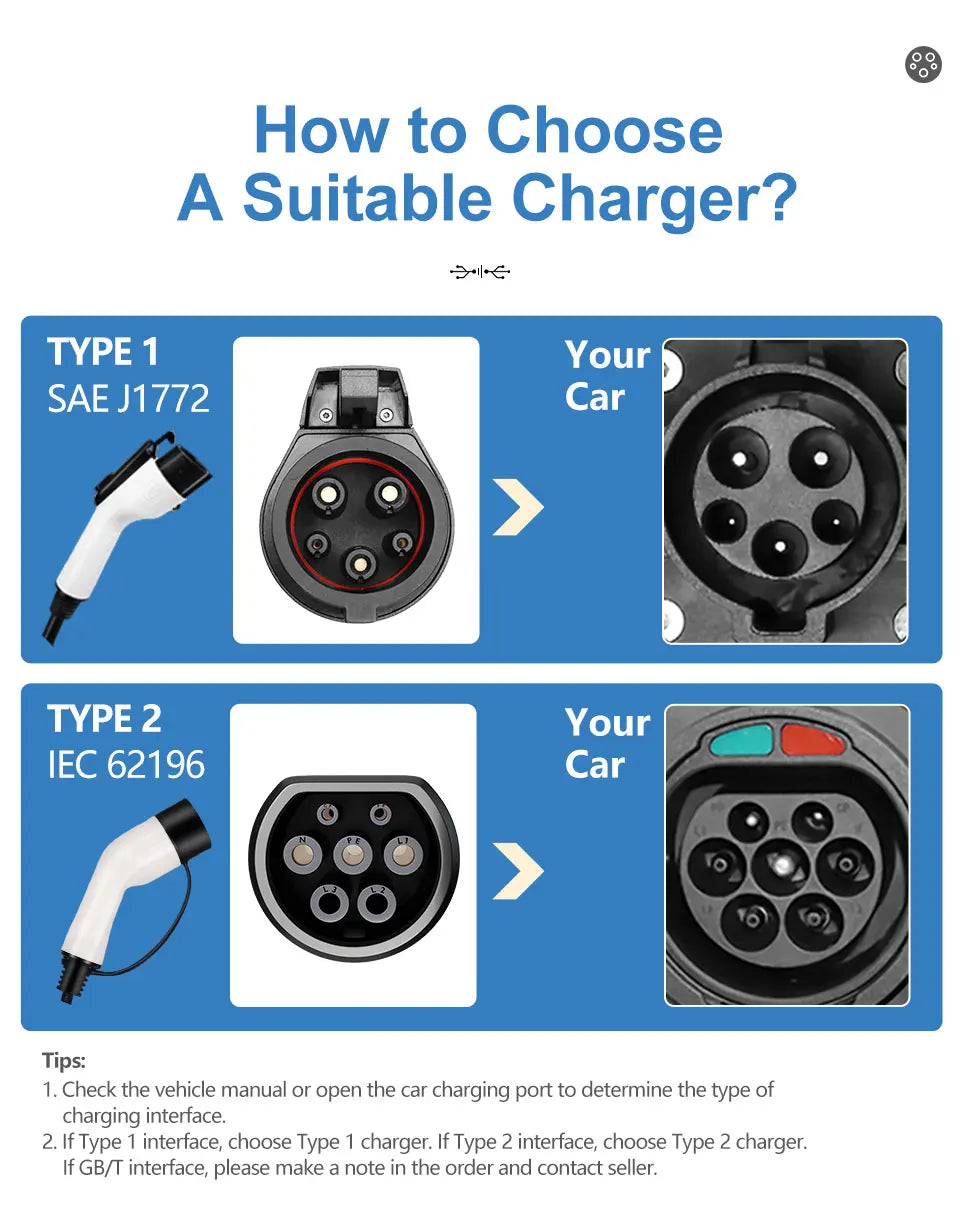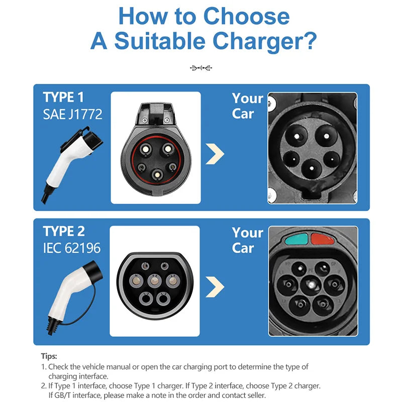 🔌 Universal Compatibility: Works with all EVs supporting Type 1 (J1772) and Type 2 connectors