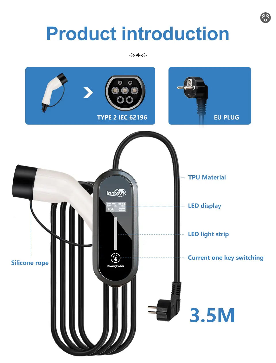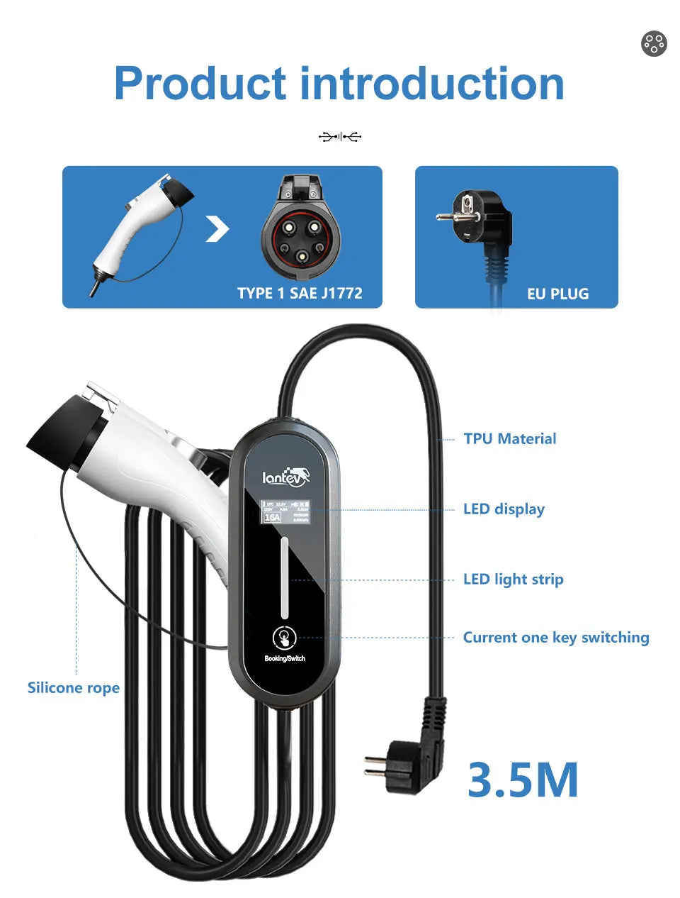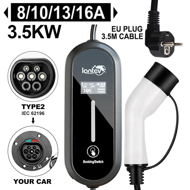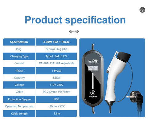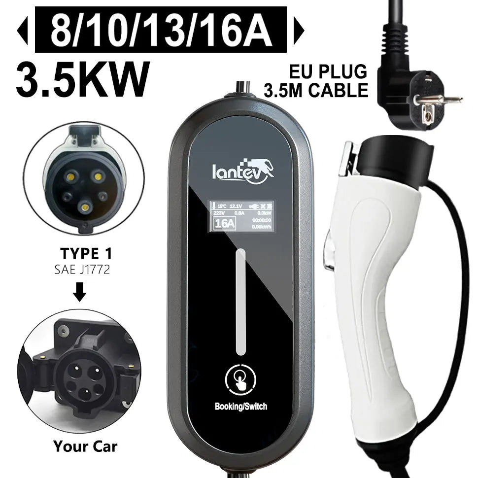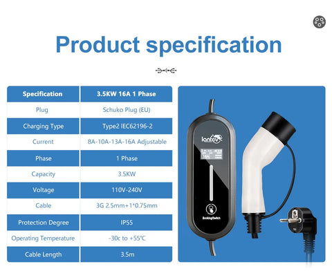 The Iantev 3.5KW Portable Electric Vehicle Charger brings flexibility and power to your EV charging experience—whether at home, at work, or on the go. Designed for both Type 1 (J1772) and Type 2 EV connectors, this charger supports adjustable current (8A/10A/13A/16A) and works with AC 80V–260V.