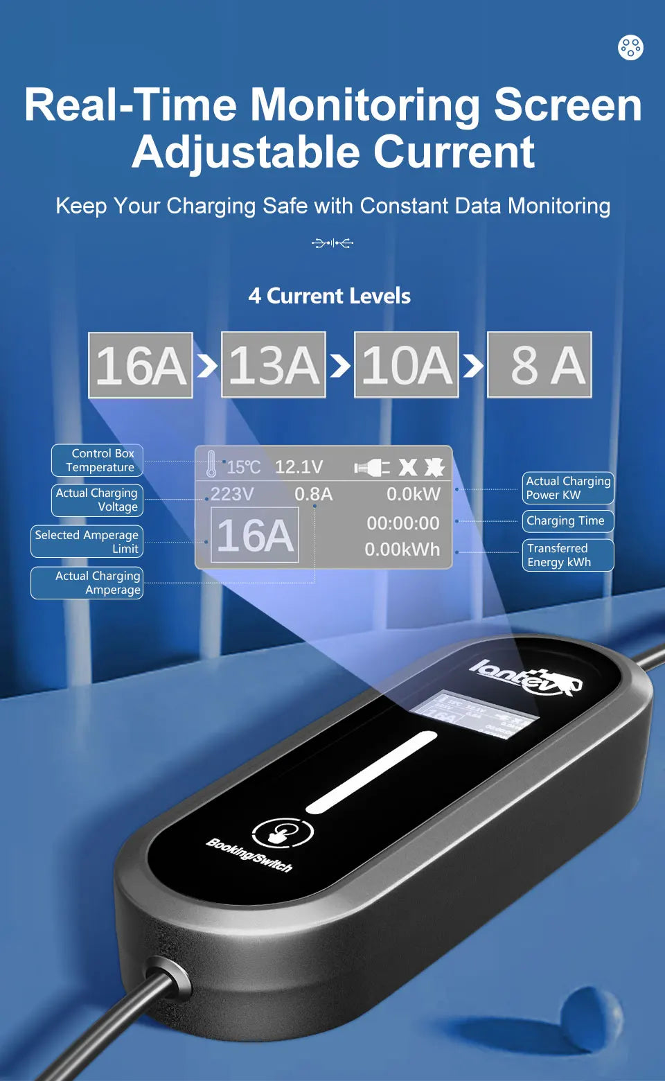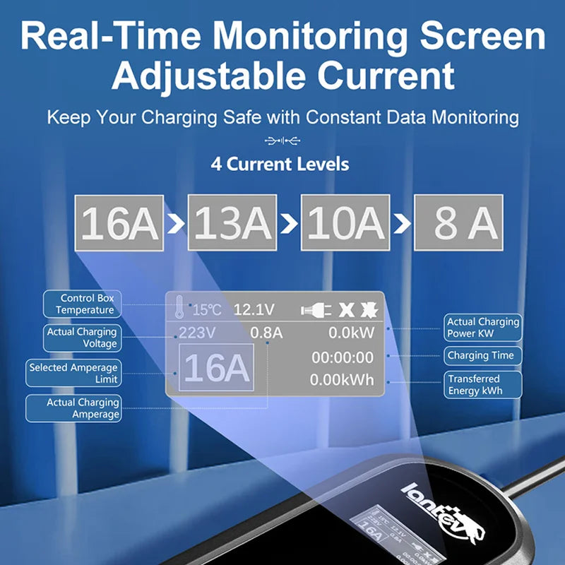 ⚡ Adjustable Current Levels: 8A, 10A, 13A, and 16A – easily select based on your charging needs