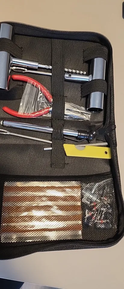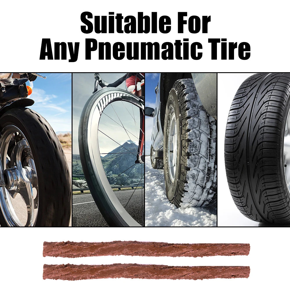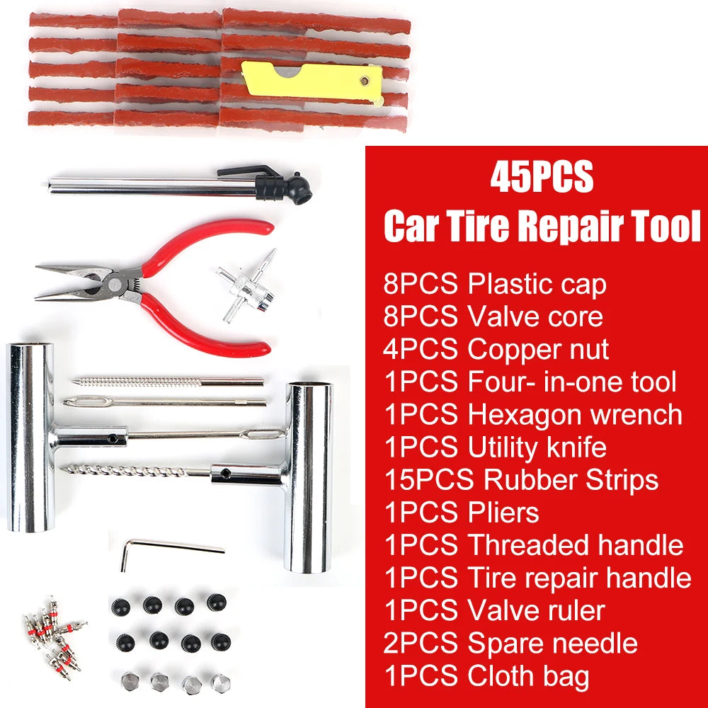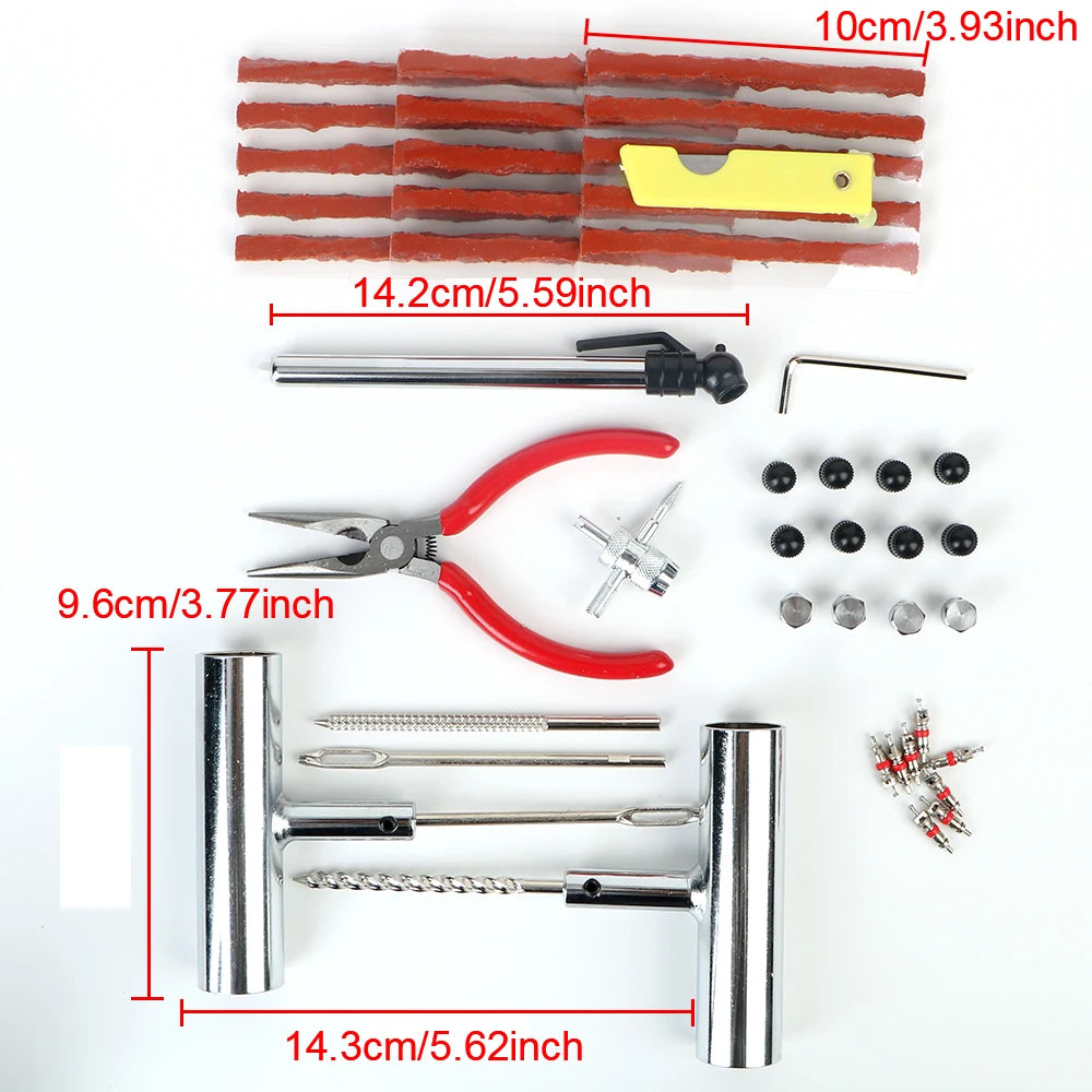 Fix flat tires fast with this 45-Piece Tire Repair Kit, compatible with cars, motorcycles, bikes, and more. Whether you're on the road or trail, this kit gives you the tools to quickly plug punctures and get back moving—no mechanic required.